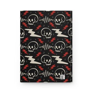 Make your everyday journaling louder. This matte hardcover journal features an all-over wrap design of hand-drawn skulls, jagged lightning bolts, and heartbeat lines set against a deep black background. Bold red strikes and bone-white details give it a sharp, rebellious edge that feels part punk, part underground zine, part late-night creative chaos. It’s clean. Graphic….