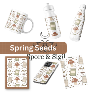 This hand-drawn seamless pattern features red woodland mushrooms, vintage-style seed packets, scattered soil details, and small sprouting plants. The design feels garden-rooted and quietly whimsical with a nod to homestead and cottage aesthetics.