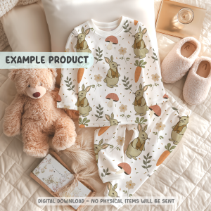 This hand-drawn seamless pattern features charming storybook rabbits wearing little vests alongside mushrooms, carrots, flowers, and delicate botanical sprigs. The design is inspired by vintage woodland illustrations and cottage garden scenes.