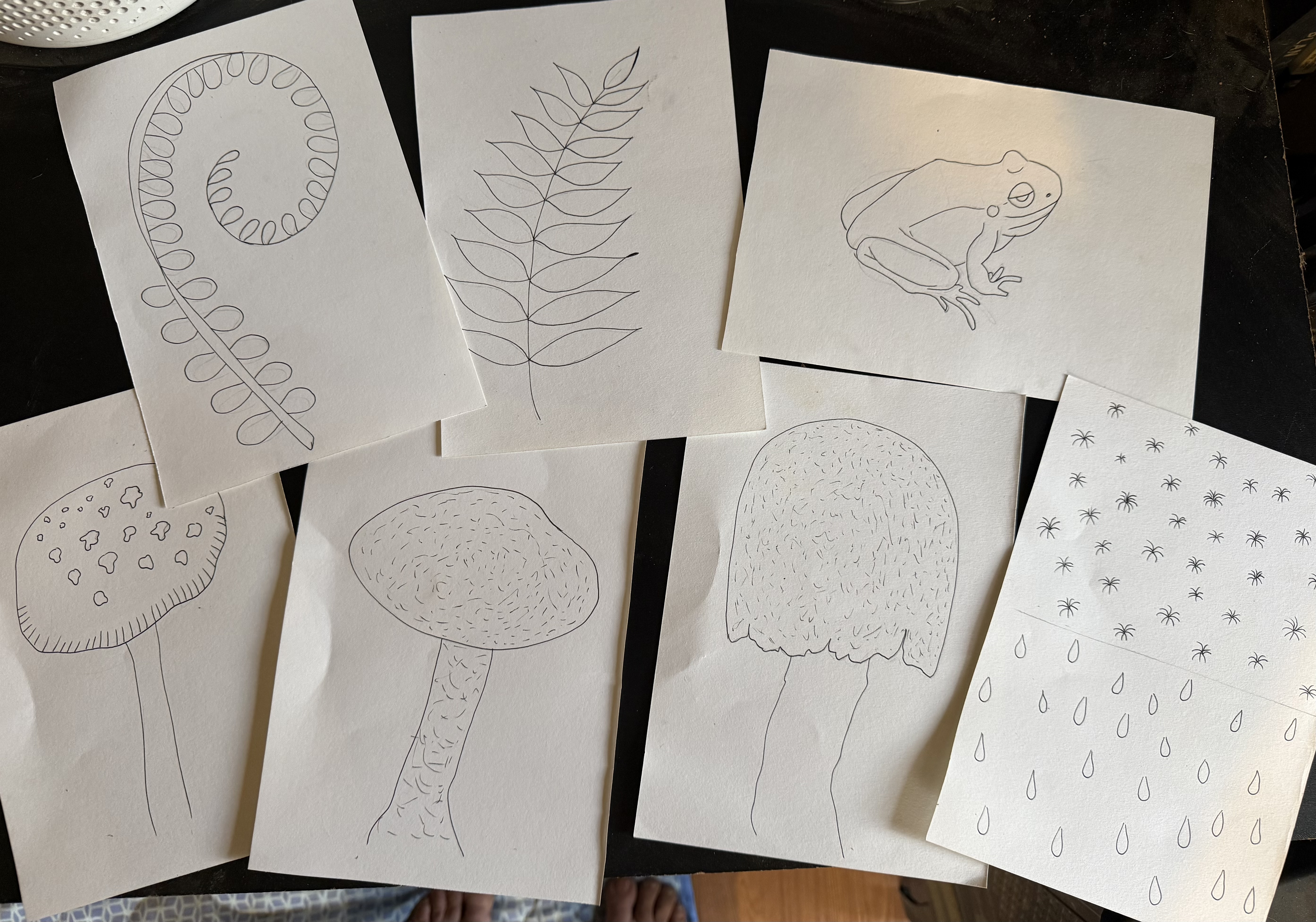 The first real step in creating a seamless pattern is developing motifs. Motifs are the individual pieces that will eventually form the pattern. In my sketchbooks, these might be mushrooms, frogs, leaves, branches, moths, stones, or small botanical shapes.