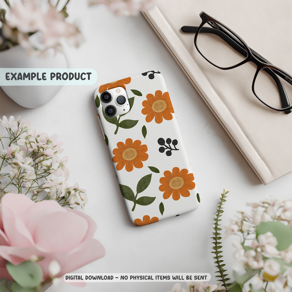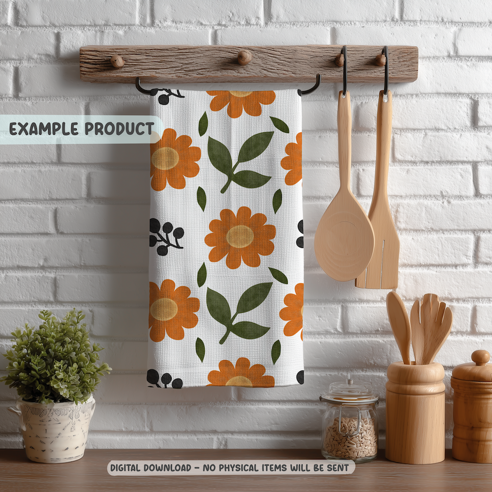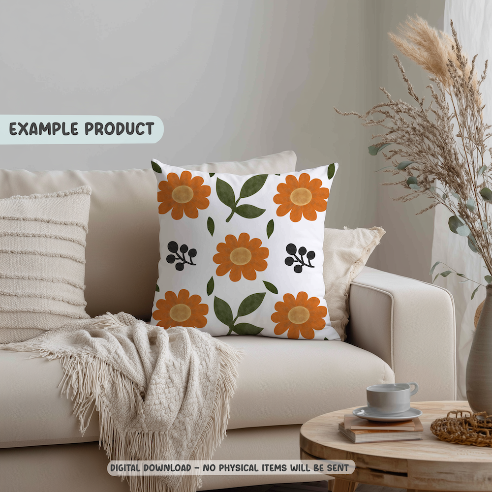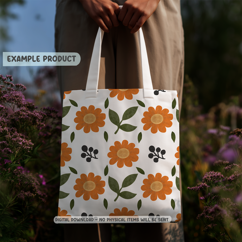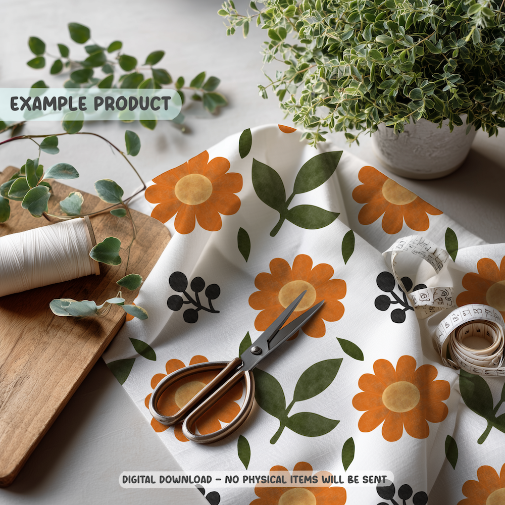 This hand-drawn seamless pattern features bold retro-inspired orange daisies paired with simple botanical leaves and dark berry accents. The design carries a subtle vintage floral influence while still feeling modern and fresh.